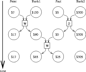38 The columns show the contents of Peter's wallet, the joint account (in Bank1), Paul's wallet, and Paul's private account (in Bank2), before and after each withdrawal (W) and deposit (D). Peter withdraws $10 from Bank1; Paul deposits $5 in Bank2, then withdraws $25 from Bank1.