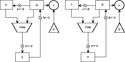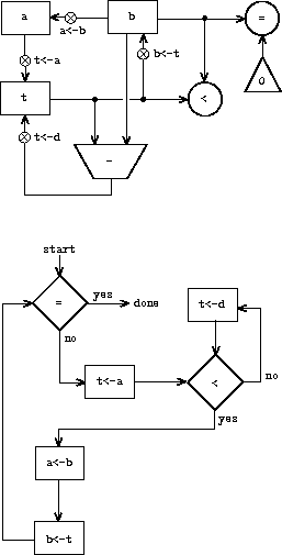 Figure 5.3 shows the GCD machine described in this way. This example only hints at the generality of these descriptions, since the GCD machine is a very simple case: Each register has only one button, and each button and test is used only once in the controller.